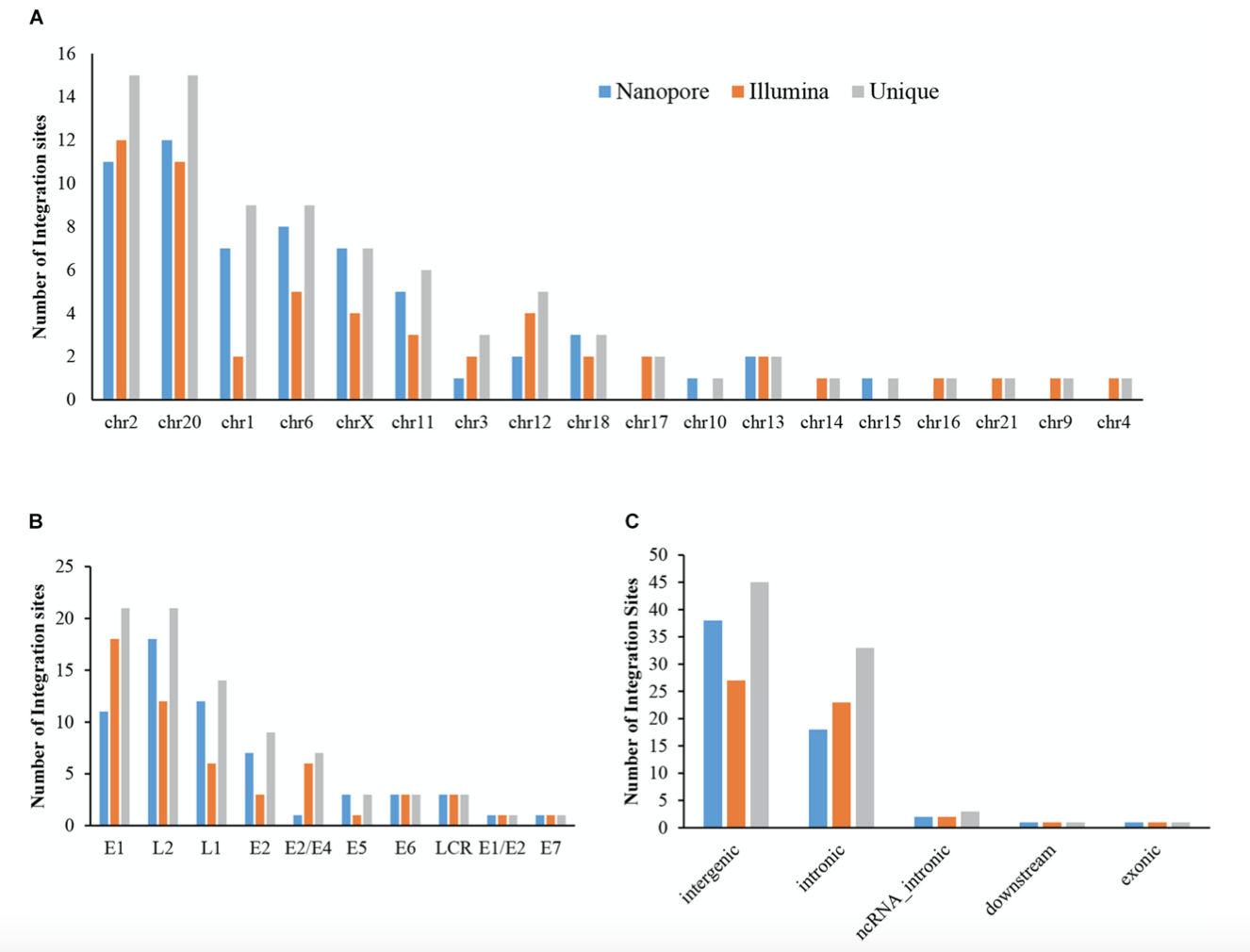 在Illumina測(cè)序獲得的54個(gè)整合位點(diǎn)中,有19個(gè)與之前報(bào)道的相符。整合所有位點(diǎn)并做韋恩圖(圖4),有13個(gè)位點(diǎn)是3種數(shù)據(jù)(Nanopore、Illumina、published)都存在的,這表明不同平臺(tái)間重復(fù)性很好。共有18個(gè)位點(diǎn)同時(shí)出現(xiàn)在Nanopore和Illumina中,三個(gè)位點(diǎn)同時(shí)出現(xiàn)在納米孔測(cè)序和以前發(fā)表的論文中,只有一個(gè)位點(diǎn)在Illumina和已發(fā)表的論文重疊。在兩個(gè)平臺(tái)中確定的整合位點(diǎn)中,一些斷點(diǎn)具有高度豐富的reads數(shù),例如HPV16:2804,chr20:32516985,Nanopore結(jié)果中有406個(gè)reads,Illumina結(jié)果中有1439個(gè)reads。其他斷點(diǎn)的reads數(shù)很少,例如HPV16:4250,chr21:97550764,其中Nanopore結(jié)果中有兩個(gè)reads,而Illumina結(jié)果中只有四個(gè)reads。