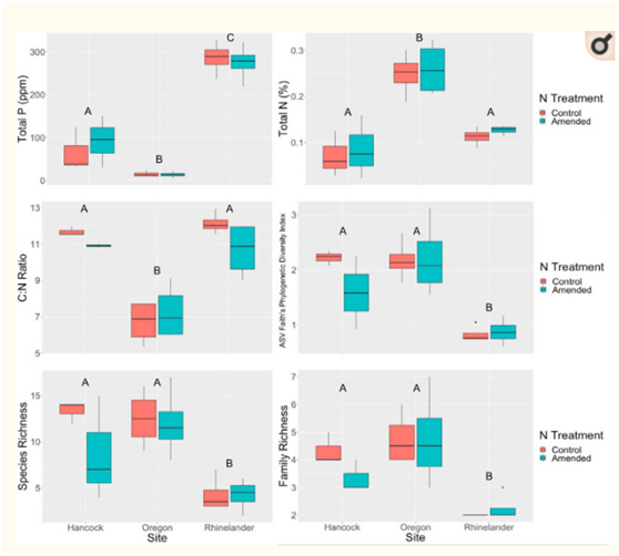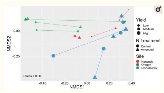 在包括施氮處理在內(nèi)的線性混合效應(yīng)回歸模型中,AMF的?ASV多樣性指標(biāo)不能顯著預(yù)測任何地點的柳枝稷產(chǎn)量。在科水平上,AMF豐富度是俄勒岡地塊產(chǎn)量的邊際顯著預(yù)測因子;俄勒岡地區(qū)AMF群落中科水平的豐富度越高,柳枝稷產(chǎn)量就越高,表明隨著AMF家族的豐富,柳枝稷可能由于AMF功能互補(bǔ)而受益于更大的多樣性。