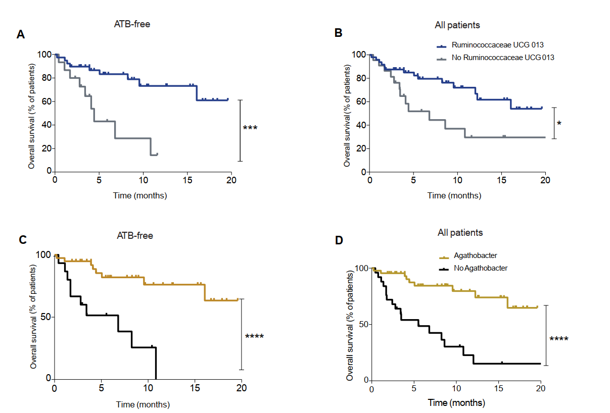 由于ATB的使用顯著改變了GM的組成,作者通過(guò)排除接受ATB治療的患者來(lái)描述GM組成。在無(wú)ATB組,alpha多樣性降低與較短的OS有關(guān)(圖2A)。在beta多樣性分析中沒(méi)有發(fā)現(xiàn)不同的clusters。Ruminococcaceae UCG 13Agathobacter在具有良好ORR和PFS>6個(gè)月的個(gè)體中富集(圖2B和2C)。Ruminococcaceae UCG 13在OS>12個(gè)月的患者中富集(圖2D)。在未接受ATB治療的患者中,Clostridiales order在OS>12個(gè)月的患者中富集(圖2D)。