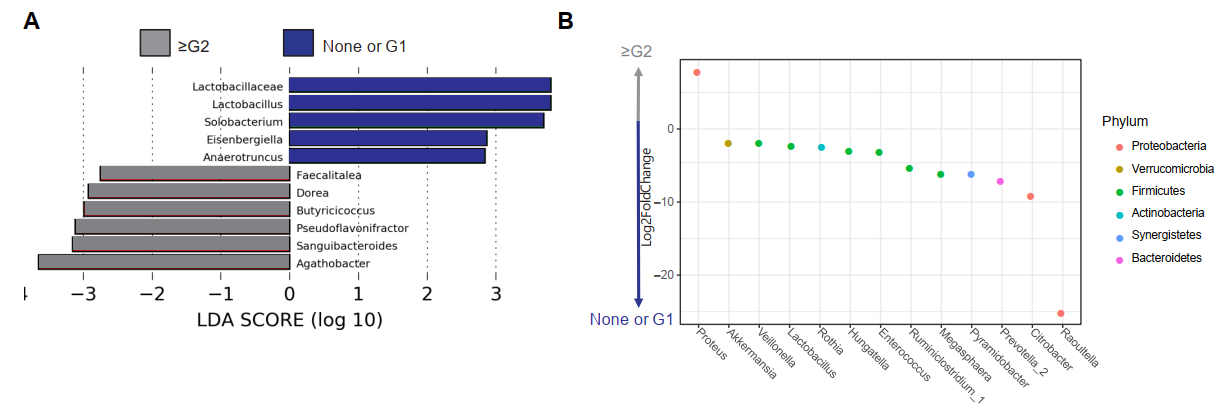 考慮到GM與irAE之間的可能存在聯(lián)系,作者分析了經(jīng)歷臨床相關(guān)irAE的患者(>2級(jí))和不嚴(yán)重的irAE患者(1級(jí)或無(wú))之間的GM組成間的差異。在未接受ATB治療的患者和所有患者中,組間的細(xì)菌多樣性沒(méi)有差異。LEfSe分析中Lactobacillaceae和DESeq2分析中Raoultella?在未經(jīng)歷嚴(yán)重irAE患者糞便中富集(圖4A和4B)。盡管Akkermensia與改善的臨床結(jié)果無(wú)關(guān),但是其與較輕的irAE相關(guān)(圖4B)。