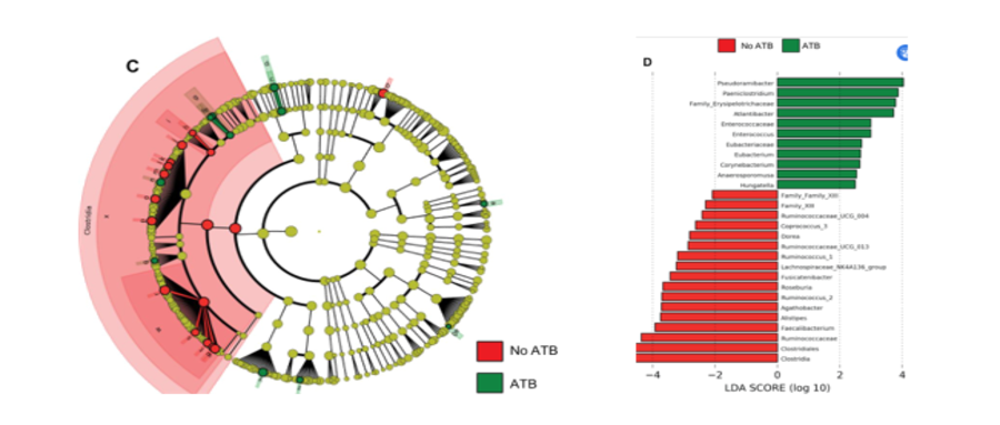 作者研究了ATB對(duì)GM組成的影響。ATB的使用與Shannon和Inverse Simpson指數(shù)減少有關(guān)(圖1A)。在分析ATB和無(wú)ATB組beta多樣性時(shí),聚類到兩個(gè)clusters(圖1B)。未接受ATB治療的患者糞便中富集Clostridia,尤其是Ruminococcaceae UCG 13、Clostridiales?和?Agathobacter(圖1C)。而接受ATB治療的患者糞便中富集Hungatella(圖1D)。