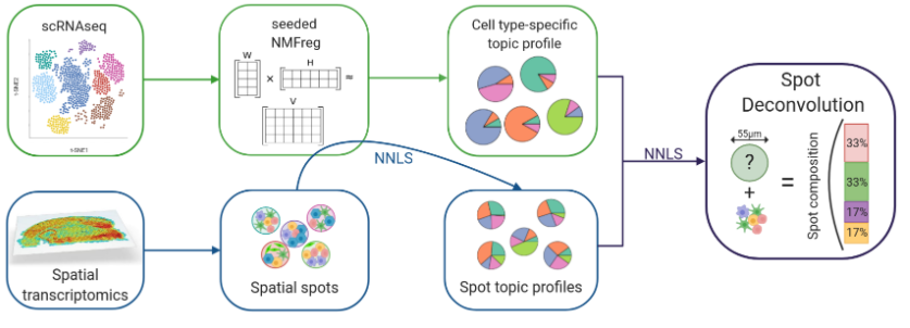 ?現(xiàn)在10x Visium數據基礎的分析思路是將每個spot看作一個細胞,然后參考單細胞轉錄組的分析思路進行分析。但是現(xiàn)在的實驗中,單個spot中包含不僅是一個細胞。如何確定每個spot中包含的細胞,對于空間轉錄組的分析是有幫助的。SPOTlight可以結合單細胞RNA測序信息反卷積空間數據,識別每個spot中的細胞類型和比例。