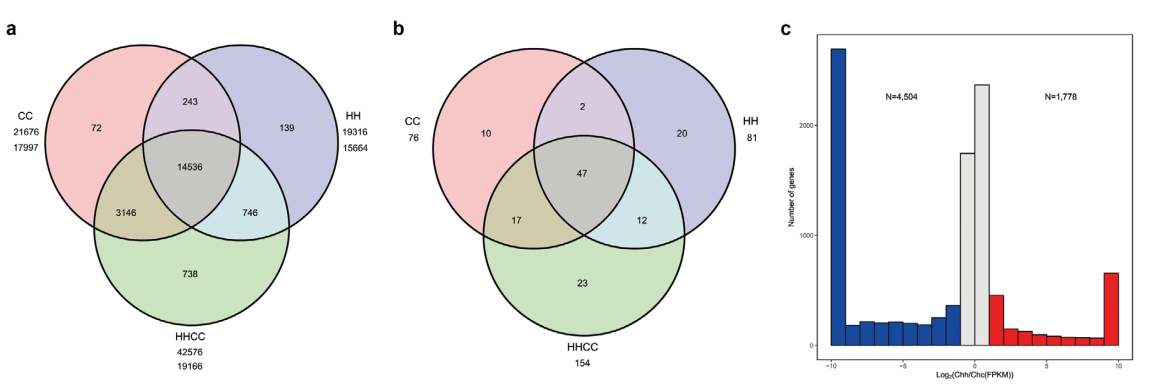 與已測(cè)序的栽培黃瓜基因組一樣,金瓜中大部分的TE為長(zhǎng)末端重復(fù)序列。Chytivus(S14)的Chc亞基因組(SubC)含有的TEs少于二倍體C.sativus(CC)基因組,而Chh亞基因組(SubH)保持了幾乎相同的不同類型TEs的含量和比例。共預(yù)測(cè)了45687個(gè)基因,平均基因長(zhǎng)3846bp,每個(gè)基因有5.26個(gè)外顯子。BUSCO評(píng)估結(jié)果為90.90%,CEGMA評(píng)估結(jié)果為97.82%。在CC和HH二倍體基因組中鑒定的18882個(gè)同源基因家族中,在C.×hytivus(S14)異源四倍體中也鑒定了18428個(gè)(97.60%)(圖2)。