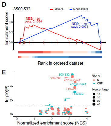 采用類似GSEA的分析方法,來鑒定一個突變體是否富集嚴(yán)重/非嚴(yán)重的臨床表型。發(fā)現(xiàn)Δ500-532與ESR等嚴(yán)重相關(guān)表型呈負(fù)相關(guān)。基于有/沒有某種變異類型,將病例分為兩組,發(fā)現(xiàn)感染Δ500 -532病毒的患者在所有檢測的35種變異中Ct值最高(圖3E)。