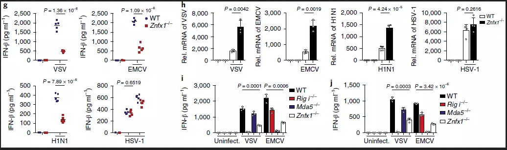 為了研究ZNFX1在體內(nèi)的生理作用,使用CRISPR/Cas系統(tǒng)生成了Znfx1-/-C57BL/6J小鼠。Znfx1-/-小鼠存活,沒有明顯的生理或行為異常。在這項研究中使用了六至八周大的小鼠。首先,分離野生型和Znfx1-/-小鼠的BMDM并用VSV、EMCV、H1N1或HSV-1感染,與野生型相比,Znfx1-/-BMDM的IFN-α或IFN-β分泌較低。RNA病毒感染后,包括VSV、EMCV和H1N1,但不包括HSV-1(圖2g),Znfx1-/-BMDM中檢測到較高的病毒mRNA水平,但在HSV-1感染的細胞中未檢測到較高的病毒mRNA水平(圖2h)。與野生型相比,Znfx1-/- MEF和A549細胞在RNA病毒感染VSV和EMCV后表現(xiàn)出較低的IFN-β分泌(圖2i,j)。