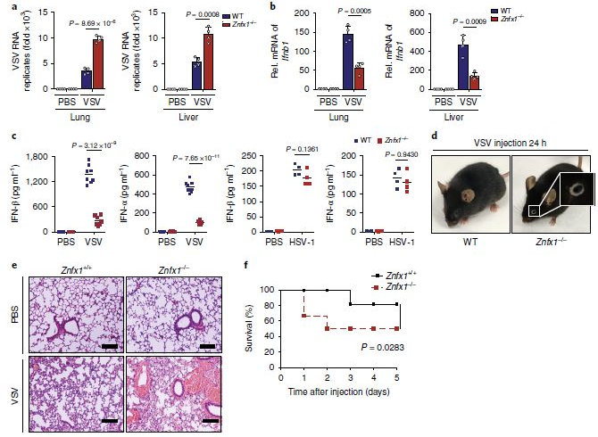 ZNFX1在宿主體內(nèi)對抗病毒感染的防御中的重要性:通過尾靜脈向野生型和Znfx1-/-小鼠注射了VSV。與野生型小鼠相比,Znfx1-/-小鼠的肺和肝中的VSV復(fù)制增強了(圖3a),隨著肺和肝中Ifnb1表達的減少,在Znfx1-/-小鼠中血清中IFN-α和IFN-β的分泌降低(圖3b,c)。而HSV-1感染后,Znfx1-/-和野生型小鼠之間血清中的IFN-α和IFN-β沒有差異(圖3c)。有趣的是,VSV感染一天后,Znfx1-/-小鼠中有80%患有結(jié)膜炎,這是VSV感染的早期癥狀(圖3d)。另外,觀察到VSV感染后炎性細胞更多地滲透到Znfx1-/-小鼠的肺中(圖3e),并且Znfx1-/-小鼠在存活試驗中對VSV感染的抵抗力較弱(圖3f)。這些數(shù)據(jù)表明,Znfx1缺乏后體內(nèi)產(chǎn)生較少的I型IFN,削弱了針對RNA病毒感染的先天免疫反應(yīng)??傊?,ZNFX1專門針對RNA病毒發(fā)揮其抗病毒特性。