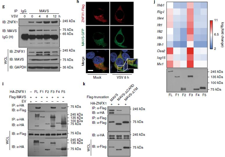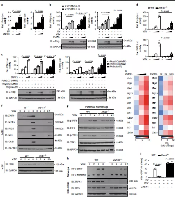 為了研究ZNFX1在IFN信號傳導(dǎo)中的作用,通過ZNFX1過表達質(zhì)粒和Ifnb1-reporter或IFN刺激的應(yīng)答元件(ISRE)報告質(zhì)粒瞬時轉(zhuǎn)染A549細胞進行螢光素酶報告基因分析,然后進行或不進行VSV感染。結(jié)果表明,ZNFX1的過表達輕微激活了Ifnb1啟動子和ISRE報告基因(圖4a)。此外,ZNFX1以劑量依賴的方式顯著增強了由VSV、2種類型的poly(I:C)或poly(dA:dT)觸發(fā)的Ifnb1啟動子激活(圖4b,c)。相反,敲除Znfx1可降低VSV誘導(dǎo)的293T細胞中Ifnb1報告基因和ISRE報告基因的激活(圖4d)。Ifnb1和ISGs的轉(zhuǎn)錄以劑量和時間依賴性的方式誘導(dǎo)(圖4e),當(dāng)ZNFX1在A549細胞中過表達時隨著劑量和時間增強反之敲除ZNFX1則降低。而與野生型細胞相比,Znfx1-/-A549和MEF細胞中ISG蛋白表達量分別減少(圖4f)。VSV感染后Znfx1-/-巨噬細胞中TBK1和IRF3的磷酸化低于野生型巨噬細胞(圖4g)。在VSV感染的Znfx1-/-293T細胞中,IRF3的二聚化也低于野生型細胞(圖4h)。野生型A549細胞中觀察到了VSV的限制性復(fù)制,但在Ifnar1-/-A549細胞中未觀察到(圖4i)。所有這些數(shù)據(jù)表明,ZNFX1通過誘導(dǎo)I型IFN的產(chǎn)生而參與抗病毒免疫反應(yīng),其抗病毒特性也取決于IFN信號傳導(dǎo)。