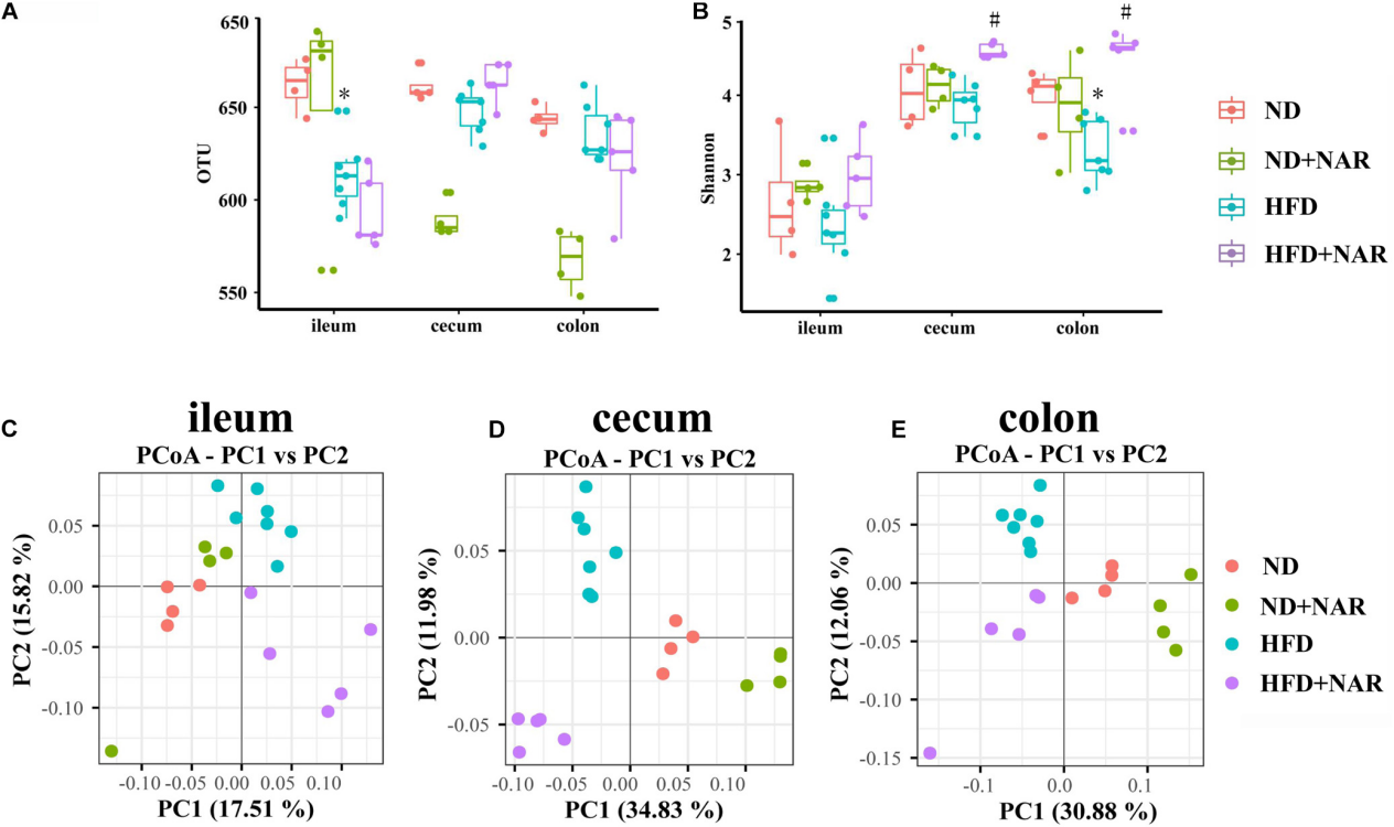 除HFD組回腸、盲腸和結(jié)腸的OTUs較ND組降低外,4組腸道不同部位的細(xì)菌OTUs無(wú)明顯差異(圖5A)。添加NAR降低了ND組小鼠盲腸和結(jié)腸OTUs。Shannon多樣性結(jié)果表明,高脂飼喂降低了結(jié)腸細(xì)菌多樣性,而NAR增加了盲腸和結(jié)腸細(xì)菌多樣性(圖5B)。高脂飼喂和NAR對(duì)回腸細(xì)菌多樣性沒(méi)有影響。
