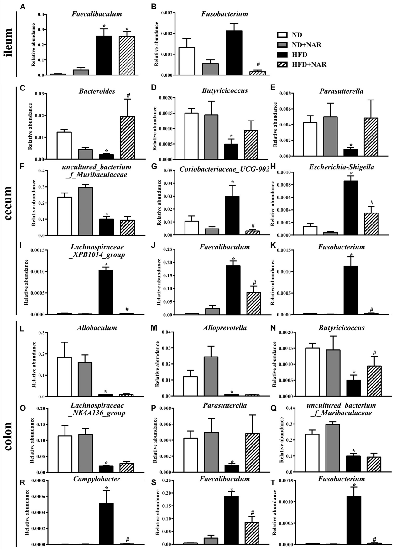 優(yōu)勢(shì)菌屬和差異菌屬熱圖顯示,補(bǔ)充NAR改變了HFD誘導(dǎo)的腸道細(xì)菌變化(圖6D-F)。與ND組相比,HFD組盲腸中Coriobacteriaceae_UCG-002、Escherichia-Shigella、Faecalibaculum、Fusobacterium、Lachnospiraceae_XPB1014_group、Parvibacter、Ruminococcaceae_UCG-005和Turicibacter相對(duì)豐度較高,Campylobacter、Dubosiella、Faecalibaculum和Fusobacterium在結(jié)腸中相對(duì)豐度較高,Bacteroides在盲腸中相對(duì)豐度較低,Butyricicoccus在結(jié)腸中相對(duì)豐度較低。NAR處理逆轉(zhuǎn)了這些效果。與ND組相比HFD飼喂小鼠腸道菌群顯示Butyricicoccus、Parasutterella和uncultured_bacterium_f_Muribaculaceae在盲腸中相對(duì)豐度較低,Allobaculum、Alloprevotella、Lachnospiraceae_NK4A136_group、Parasutterella和uncultured_bacterium_f_Muribaculaceae在結(jié)腸中相對(duì)豐度較低,F(xiàn)aecalibaculum在回腸中相對(duì)豐度較高。HFD+NAR組Bradyrhizobium、[Eubacterium]_nodatum_group、GCA-900066575、Jatrophihabitans、Massilia、Peptococcus、Sphingomonas、uncultured_bacterium_o_Acidobacteriales、uncultured_bacterium_f_Micropepsaceae和uncultured_bacterium_f_Xanthobacteraceae在盲腸中相對(duì)豐度較高,Bacteroides、Bradyrhizobium、Candidatus_Solibacter和 uncultured_bacterium_f_Xanthobacteraceae在結(jié)腸中相對(duì)豐度較高,F(xiàn)usobacterium在回腸中相對(duì)豐度較低。圖7為相對(duì)豐度改變的細(xì)菌統(tǒng)計(jì)結(jié)果,這些結(jié)果表明NAR調(diào)節(jié)了HFD小鼠腸道細(xì)菌。