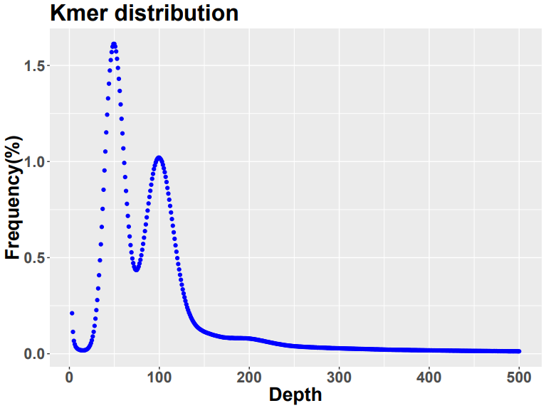 在理想狀態(tài)下,K-mer曲線服從泊松分布,即只會(huì)出現(xiàn)一個(gè)明顯的主峰。但對(duì)于一個(gè)雜合二倍體,主峰前1/2出會(huì)出現(xiàn)一個(gè)雜合峰,在雜合度較高的時(shí)候可能出現(xiàn)高過(guò)主峰的情況。下圖即為一個(gè)高雜合二倍體kmer的頻率-深度分布圖。主峰后二倍位置內(nèi)的峰為重復(fù)峰。但如果雜合度很低,可能分布圖中只有一個(gè)峰存在。主峰所代表的就是k-mer平均覆蓋深度,用主峰深度代替公式中的k-mer平均覆蓋深度即可算得該基因組的大小。