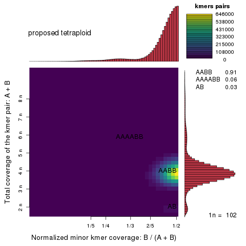 Smudgeplot通過(guò)尋找雜合k-mer來(lái)研究基因組的倍性,其定義的雜合k-mer對(duì)指的是一對(duì)k-mer之間只相差一個(gè)堿基,且沒(méi)有第三個(gè)k-mer與他們?cè)傧嗖钜粋€(gè)堿基(如ATGATCA, ATGCTCA, ATGGTCA)。對(duì)于一個(gè)AB形式的雜合,smudgeplot試圖從所有k-mer中尋找一對(duì)雜合k-mer,而對(duì)于一個(gè)AAB形式的雜合,smudgeplot試圖尋找兩條相同的k-mer和一條它們的雜合k-mer,在圖中表示為更高的亮度。如下圖對(duì)一個(gè)四倍體的smudgeplot分析,可以明顯的看出AABB雜合模式附近的k-mer數(shù)量明顯高于其它k-mer,左上角也描述了這個(gè)結(jié)果。