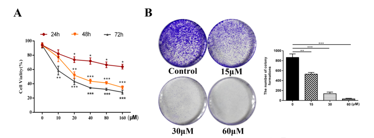 在平板克隆形成試驗中,與未經(jīng)處理的對照組相比,經(jīng)不同濃度(15、30和60μM)的α- Cyperone處理的HeLa細(xì)胞形成的集落更少且更小,這表明α- Cyperone以劑量依賴性方式降低HeLa細(xì)胞的集落形成能力(圖1B)