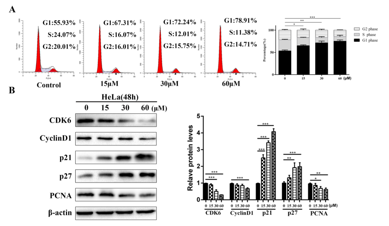 為了研究α-Cyperone是否抑制HeLa細(xì)胞的細(xì)胞周期進程,作者用不同濃度(0、15、30和60μM)的α-Cyperone處理細(xì)胞24小時,然后收集細(xì)胞進行細(xì)胞周期分析。結(jié)果表明,α-Cyperone處理使G1期細(xì)胞百分率增加,G1期細(xì)胞百分率分別增加6.17%、15.20%和21.30%(圖2A)。采用westernblot檢測cdc25A、cyclind1、CDK6、PCNA、p21和p27的表達(dá)水平,進一步探討α-Cyperone對G1細(xì)胞周期阻滯的作用機制。作者發(fā)現(xiàn)α-Cyperone下調(diào)cdc25A、cyclind1、CDK6和PCNA蛋白水平,同時上調(diào)p21和p27蛋白表達(dá)(圖2B)。