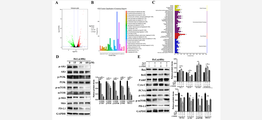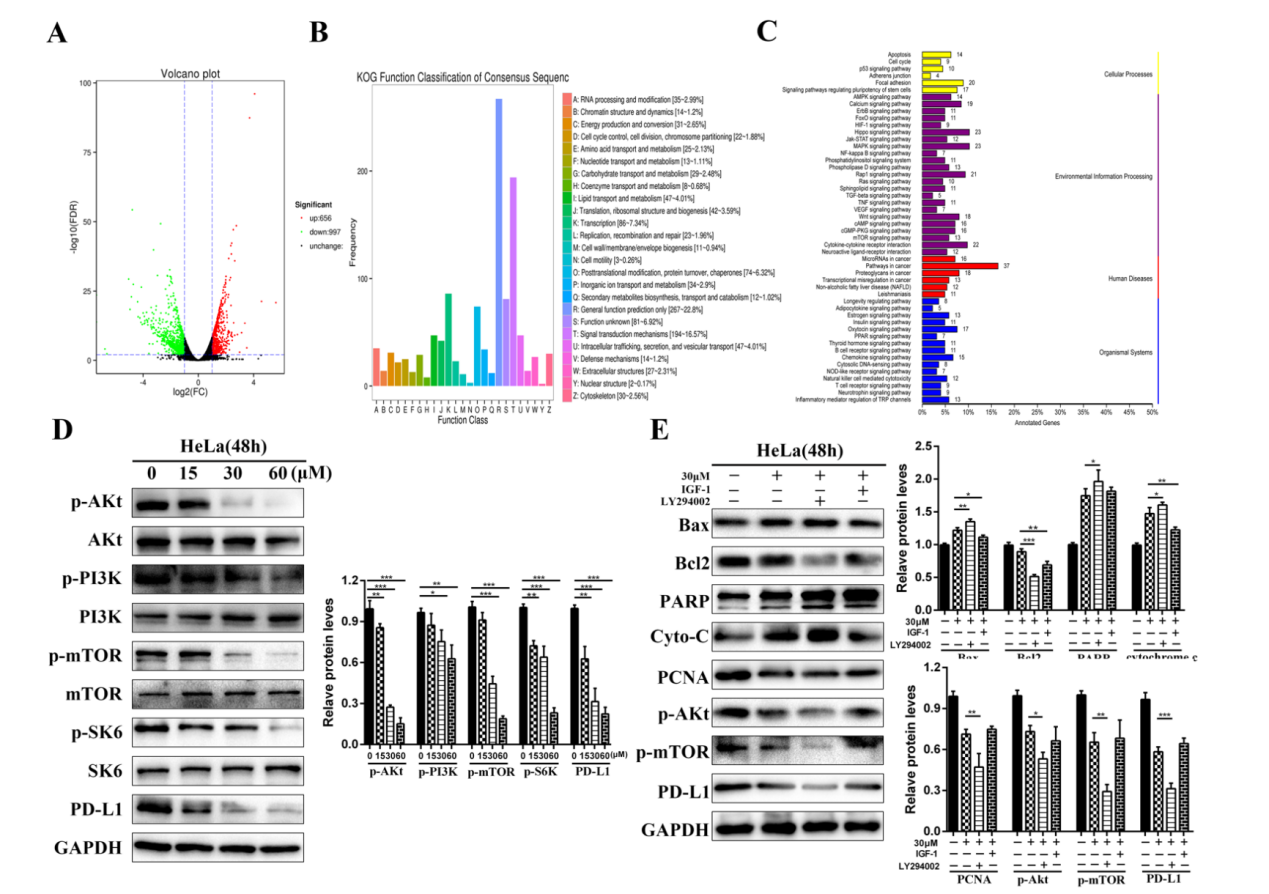 結(jié)果表明,α-Cyperone能抑制HeLa細(xì)胞的增殖并誘導(dǎo)其凋亡。從機制上講,α-Cyperone通過線粒體凋亡途徑促進HeLa細(xì)胞凋亡,細(xì)胞內(nèi)活性氧(ROS)水平升高,細(xì)胞色素c、半胱氨酸蛋白酶-3、PARP和Bax的表達(dá)上調(diào)。進一步的RNA測序顯示α-Cyperone抑制HeLa細(xì)胞PI3K/Akt/mTOR信號通路的激活,PI3K抑制劑和激動劑證實了這一點。PI3K抑制劑(LY294002)與α-Cyperone協(xié)同抑制HeLa細(xì)胞的生長,而PI3K激動劑(IGF-1)則消除了這種作用。有趣的是,α-Cyperone和LY294002均能抑制PD-L1的表達(dá),而IGF-1的補充則能挽救PD-L1的低表達(dá)。綜上所述,作者的研究結(jié)果揭示了α-Cyperone對HeLa細(xì)胞生長的抑制作用是通過ROS介導(dǎo)的PI3K/Akt/mTOR信號通路觸發(fā)的,并且與PD-L1表達(dá)的下降密切相關(guān)。