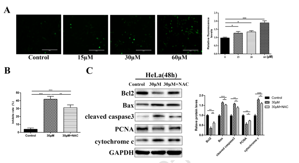 如圖4A所示,在濃度分別為15、30和60μM的α-Cyperone作用48小時后,Hela細(xì)胞產(chǎn)生的細(xì)胞ROS分別增加到30.12%、37.30%和94.67%。然后,作者進一步確定ROS抑制劑(N-乙酰半胱氨酸,NAC)預(yù)處理是否能保護HeLa細(xì)胞免受α-Cyperone的細(xì)胞毒作用。如4B所示,與α-Cyperone單獨治療組相比,NAC和α-Cyperone聯(lián)合治療可顯著降低細(xì)胞色素c、Bax的表達(dá),增加PCNA和Bcl-2的表達(dá)。結(jié)果表明,α-Cyperone誘導(dǎo)HeLa細(xì)胞生長抑制是通過破壞氧代謝平衡實現(xiàn)的。