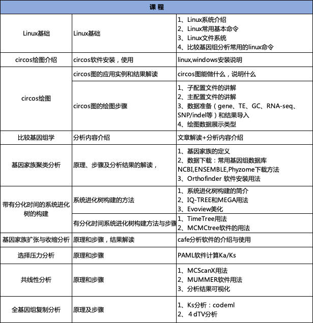隨著測序技術(shù)的發(fā)展及測序成本的降低,越來越多的物種完成了基因組的組裝,這為多物種比較基因組學(xué)分析提供了大量的可用基因組資源。為了協(xié)助科研工作者對基因組結(jié)果進(jìn)行深度挖掘,本課程將從基礎(chǔ)生信操作開始,從已發(fā)表的NG、NC等高水平文章入手,帶領(lǐng)大家學(xué)習(xí)比較基因組學(xué)常用的分析方法,從而滿足文章后期發(fā)表的需求,同時也為我們生物信息科學(xué)工作者們提供一個互相交流的平臺。