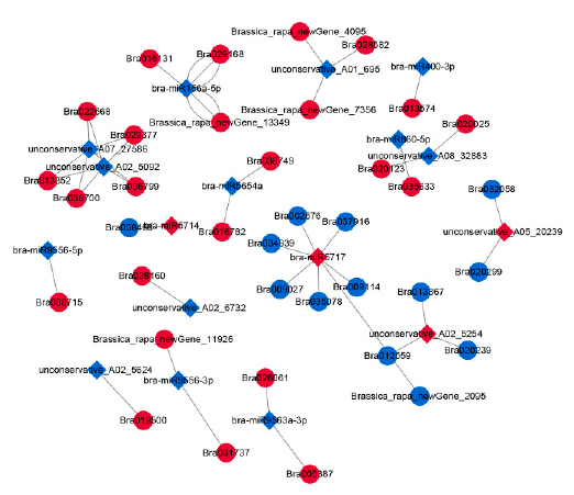 作者使用了TargetFinder來預(yù)測miRNA的靶基因,結(jié)合差異分析的結(jié)果最終得到170對miRNA和基因的調(diào)控關(guān)系,包含了18個miRNA和37個基因。對這些基因進(jìn)行GO富集分析,發(fā)現(xiàn)主要是細(xì)胞過程、代謝過程等功能。對構(gòu)建的網(wǎng)絡(luò)進(jìn)行研究發(fā)現(xiàn)miRNA所調(diào)控的基因主要是涉及糖代謝、脂質(zhì)代謝、花粉管生長等,同時也發(fā)現(xiàn)這些miRNA與植物激素相關(guān),比如bra-miR9556-5p可能通過靶向Bra008715來參與水楊酸介導(dǎo)的信號通路和油菜素類固醇生物合成過程途徑。