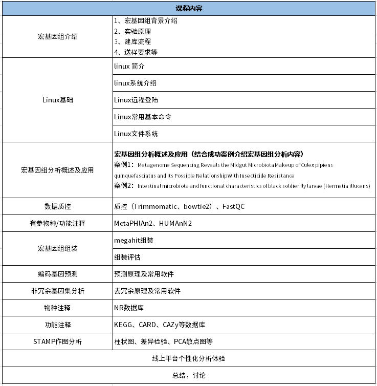 本課程從宏基因組背景介紹、實驗(實驗測序原理、建庫方法和流程、送樣注意事項等)、分析(下機數(shù)據(jù)質(zhì)控、有參注釋、無參組裝/預(yù)測/物種注釋/功能注釋等)、可視化作圖,讓您全面了解宏基因組分析每個過程,并結(jié)合案例文章,讓您了解宏基因組文章思路,助力科學(xué)研究。