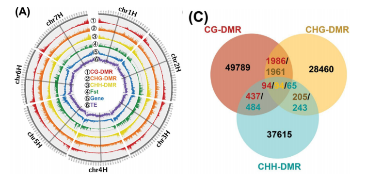 (A) 基因組中甲基化區(qū)域、Fst、基因和轉座子元件(TE) 的分布密度?(C)?三種DMR類型的維恩