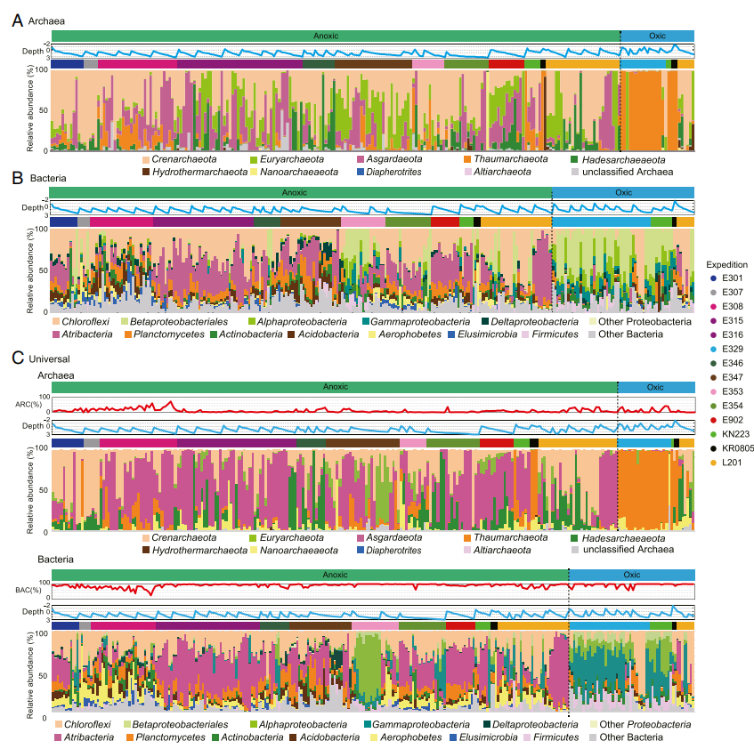 圖3 海洋沉積微生物群落的物種區(qū)系組成。(A)使用古菌特異性引物獲得的235個(gè)樣品的古菌群落組成。(B)使用細(xì)菌特異性引物獲得的272個(gè)樣品的細(xì)菌群落組成。(C)使用通用引物獲得的245個(gè)樣品的古菌群落組成和281個(gè)樣品的細(xì)菌群落組成,未顯示少于1,000條序列的樣本。淺藍(lán)色折線圖以對數(shù)刻度顯示沉積物深度。