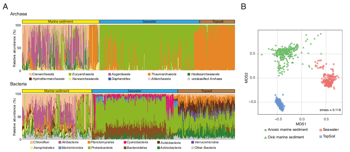 為了評估海洋沉積微生物群落與其他主要環(huán)境中微生物群落的關(guān)系,作者將海洋沉積物通用引物與使用相同通用引物的引物進(jìn)行微生物群落分析的海水和表層土壤的已發(fā)表序列進(jìn)行了比較。本研究中這三種生態(tài)環(huán)境的微生物群落中的細(xì)菌和古菌群落組成明顯不同(圖4)。如圖3所示,Crenarchaeota和Asgardaeota在海洋沉積物中占優(yōu)勢,而Euryarchaeota和Thaumarchaeota在海水中占優(yōu)勢,而Thaumarchaeota在表層土壤中占優(yōu)勢。細(xì)菌群落組成表明變形桿菌在表層土壤和海洋中占據(jù)優(yōu)勢。此外,Cyanobacteria,Marinimicrobia和Bacteroidetes在海水中占主導(dǎo)地位,而Acidobacteria和Verrucomicrobia在表層土壤中更為重要。在海洋沉積物中普遍存在著Atribacteria和Aerophobetes,但其他兩個(gè)環(huán)境中卻沒有這些細(xì)菌,這表明海洋沉積微生物構(gòu)成了一個(gè)獨(dú)特的生物群落。ASV組成的樣品間相似性表明這三個(gè)生物群落中的群落不同(圖4B),海洋沉積物中樣品間的多樣性更高。與其他環(huán)境相比,這種高多樣性可能反映了海洋沉積物棲息地條件的劇烈變化。