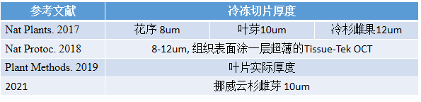 動物組織樣本細胞類型,結(jié)構(gòu)相對比較簡單,切片厚度比較統(tǒng)一,基本上保持在10μm厚度左右。但是植物樣本組織結(jié)構(gòu)復(fù)雜,而且木質(zhì)化程度不一,組織相對RNA含量較低,因此植物切片厚度一般根據(jù)樣本類型不同,選擇不同的切片厚度,一般植物冷凍切片厚度范圍為10-50um,根據(jù)物質(zhì)組織類型切片厚度會有所不同,視具體情況而定。