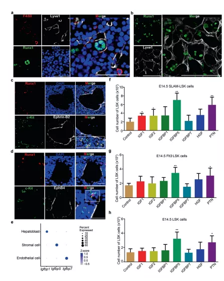 a 免疫熒光分析顯示了在 E14.5 FL 冷凍切片中 Lyve1(代表ECs)和 Runx1(代表 HSCs/MPPs)的表達(dá)。b免疫熒光分析顯示了 E14.5 FL 冷凍切片中 Lyve1(代表EC)和 Runx1(代表 HSCs/MPPs)的表達(dá)。c免疫熒光分析顯示 E14.5 FL 冷凍切片中 c-Kit(代表 HSCs/MPPs)、Runx1(代表 HSCs/MPPs)和 EphrinB2(代表動(dòng)脈門脈血管)的表達(dá)。d免疫熒光分析顯示 c-Kit(代表 HSCs/MPPs)、Runx1(代表 HSCs/MPPs)和 EphB4(代表靜脈)在 E14.5 FL 冷凍切片中的表達(dá)。e Igfbp1、Igfbp5和Igfbp7在三種結(jié)構(gòu)生態(tài)位細(xì)胞(內(nèi)皮細(xì)胞、基質(zhì)細(xì)胞和成肝細(xì)胞)中的表達(dá)模式散點(diǎn)圖。f來自 E14.5 FL 的 100 個(gè) SLAM-LSK 細(xì)胞因子培養(yǎng)物的 HSCs/MPPs(LSK 細(xì)胞)的數(shù)量。g來自 E14.5 FL的 100 個(gè)Flt3-LSK 細(xì)胞因子培養(yǎng)物的 HSCs/MPPs(LSK 細(xì)胞)的數(shù)量。h來自 E14.5 FL 的 100 個(gè) LSK 細(xì)胞因子培養(yǎng)物的 HSCs/MPPs(LSK 細(xì)胞)的數(shù)量。