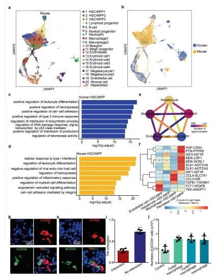 a E14.5 FL中所有細(xì)胞類型的UMAP 可視化。b來自小鼠(E14.5)和人類(受孕后 11 周)的 FL 細(xì)胞群的 UMAP 可視化。c對(duì)人類 HSCs/MPPs中top DEG 進(jìn)行 GO 生物過程相關(guān)的通路富集分析。d對(duì)小鼠 HSCs/MPPs 中top DEG進(jìn)行GO生物過程相關(guān)的通路富集分析。e配體-受體相互作用網(wǎng)絡(luò)展示了人 HSC/MPP與生態(tài)位細(xì)胞之間的潛在通訊網(wǎng)絡(luò)。f熱圖展示主要的人 HSCs/MPPs-生態(tài)位細(xì)胞相互作用對(duì)。g – h免疫熒光分析展示CD68(代表巨噬細(xì)胞)和 CD34(代表 HSCs/MPPs)在人受孕后第 11 周 FL 切片中的表達(dá)。i柱狀圖展示有和無細(xì)胞相互作用的 HSCs/MPPs 所占的比例。j源自小鼠巨噬細(xì)胞和 HSCs/MPPs 共培養(yǎng)系統(tǒng)的人 CD34 + HSCs/MPPs的數(shù)量。