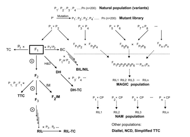 對(duì)于動(dòng)植物群體,通常利用性狀具有顯著差異的兩個(gè)親本進(jìn)行雜交,再通過(guò)自交、回交或者其他方式來(lái)構(gòu)建家系群體。家系群體按照遺傳穩(wěn)定性劃分可分為暫時(shí)性分離群體和永久性分離群體;如F1、F2、F3、BC等,這類群體中分離單位是個(gè)體,一經(jīng)自交或近交,其遺傳組成就會(huì)發(fā)生變化,無(wú)法永久使用,所以屬于暫時(shí)性分離群體;如RIL、DH等,這類群體中分離單位是株系(或者叫株行),不同株系間存在基因型的差異,而株系內(nèi)個(gè)體間的基因型是相同且純合的,自交不分離。這類群體通過(guò)自交或近交繁殖后,遺傳組成不會(huì)改變,可永久使用,所以屬于永久性分離群體。
