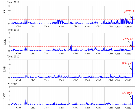 果皮厚度是一個(gè)復(fù)雜的性狀,是決定甜玉米食用品質(zhì)的關(guān)鍵因素。本研究使用兩個(gè)甜玉米品系M03(輪回親本)和M08(供體親本)構(gòu)建了包含148個(gè)品系的甜玉米 BC4F3群體。構(gòu)建了一個(gè)包含3876個(gè)SLAF標(biāo)記的高密度遺傳圖譜,并用于定位果皮厚度的QTL。檢測(cè)到14個(gè)果皮厚度相關(guān)的QTL,并在多年環(huán)境中檢測(cè)到一個(gè)穩(wěn)定的QTL(qPT10-5),解釋了10號(hào)染色體上7.78-35.38%的表型變異。在qPT10-5的目標(biāo)區(qū)域內(nèi)發(fā)現(xiàn)了42個(gè)候選基因。此外,轉(zhuǎn)錄組分析顯示,在這42個(gè)基因中,有5個(gè)基因在兩個(gè)親本之間存在差異表達(dá)。根據(jù)基因注釋信息,三個(gè)基因可能被認(rèn)為是果皮厚度的候選基因。本研究鑒定了甜玉米薄果皮品種的主要QTL和候選基因,這些結(jié)果為進(jìn)一步的功能研究奠定了基礎(chǔ)。