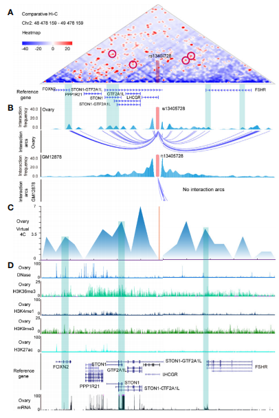 文章探索了卵巢組織的 Hi-C 相互作用并在卵巢組織和 GM12878(作為對(duì)照)之間進(jìn)行了比較 Hi-C 圖(圖 1A),發(fā)現(xiàn) FOXN2、STON1-GTF2A1L、STON1、GTF2A1L 和 FSHR是 rs13405728 (Chr2:48978158) 基因座的假定目標(biāo),在卵巢組織中具有相互作用(圖 1B)。