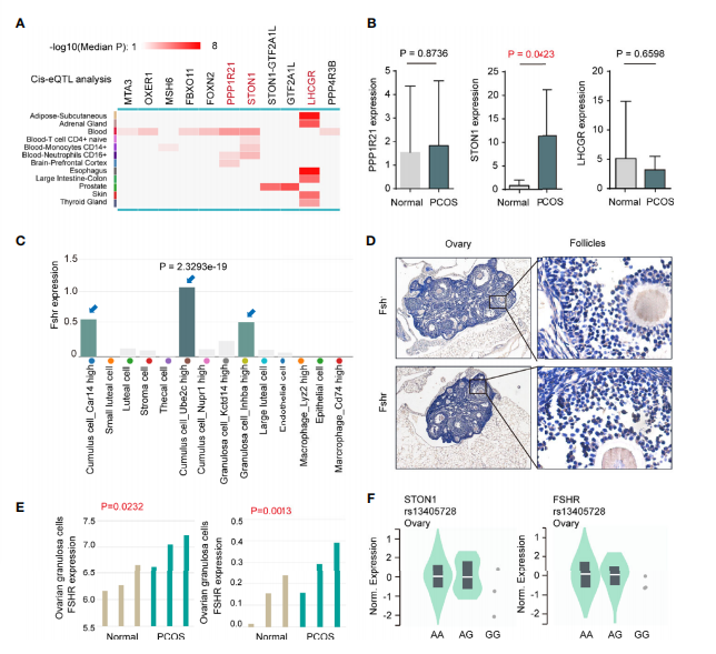 對(duì)卵巢組織的單細(xì)胞測(cè)序數(shù)據(jù)進(jìn)行映射,發(fā)現(xiàn) FSHR 在 Cumulus cell_Ube2c 簇(P = 2.3293e-19)、Granulosa cell_Inhba 簇和 Cumulus cell_Car14 簇中高度表達(dá)(圖 2C)。這種表達(dá)模式在小鼠卵巢組織中得到驗(yàn)證(圖 2D)。在患者的卵巢顆粒細(xì)胞中,發(fā)現(xiàn) PCOS 患者的 FSHR 表達(dá)高于正?;颊?,GSE114419(P = 0.0232)和 GSE138518(P = 0.0013)數(shù)據(jù)集(圖 2E)。此外,我們對(duì)卵巢組織中的 STON1、FSHR 和 rs13405728 SNP 進(jìn)行了單組織 eQTL 分析(圖 2F)。