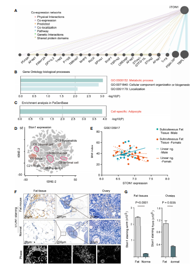 圖3. STON1 與脂肪細(xì)胞的代謝過(guò)程相關(guān),并在來(lái)自脂肪飲食小鼠的小鼠脂肪和卵巢組織中高度表達(dá)