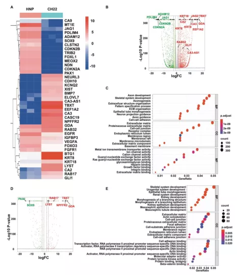 與HNP相比,在CH22中確定了313個(gè)增加的DAR 和 1,749 個(gè)減少的DAR。DAR的motif分析顯示CTCF、Nkx2-2、Tcfe2a_2、MED-1 和 E2A motif在CH22中高度富集。還確定了DAR中的DEG,如GDA、TBXT和PAX1(圖 1D)。GO分析顯示DAR中的基因與骨骼系統(tǒng)發(fā)育有關(guān)(圖 1E);KEGG富集分析顯示這些基因富集在PI3K-AKT信號(hào)通路上。