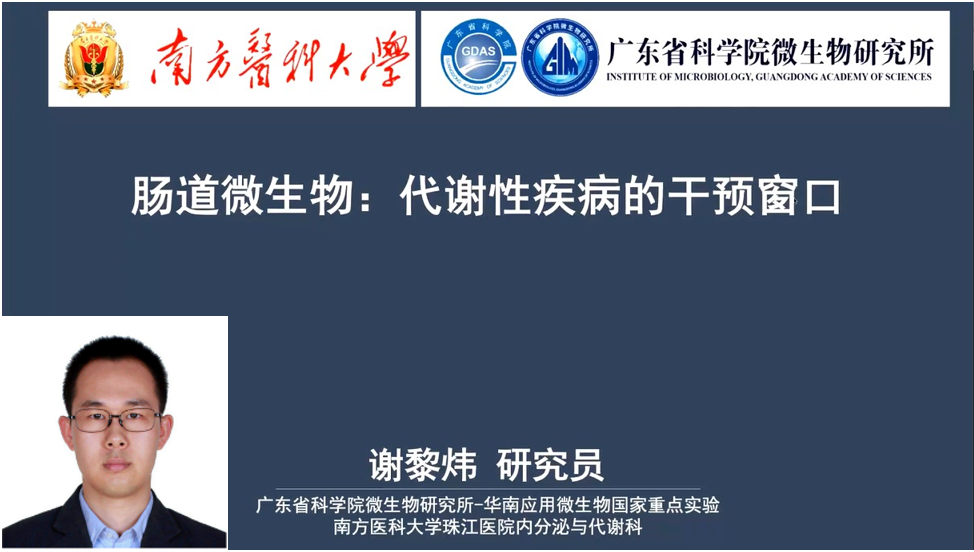 廣東省微生物研究所謝黎煒研究員講解了“腸道微生物:代謝性疾病的干預窗口”謝老師首先介紹了腸道菌群是多因素誘發(fā)肥胖癥的承載體,代謝性疾病,例如:2型糖尿病,肥胖和代謝性肝病等,嚴重損害身體健康,甚至致殘致死。研究發(fā)現(xiàn)代謝性疾病的發(fā)生和發(fā)展伴隨腸道微生物多樣性、種類和功能的變化,謝老師團隊近期開展的短期理床低碳減重研究和益生菌代謝產(chǎn)物緩解機體糖脂代謝的研究為代謝性疾病的腸道干預提供了有力的證據(jù)。