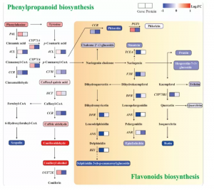 共鑒定到36個上調(diào)代謝物和47個下調(diào)代謝產(chǎn)物(圖4B),包括類黃酮,碳水化合物、氨基酸和衍生物等(圖4C)。KEGG富集分析表明差異代謝物(DAMs)主要在氨基酸生物合成、次生代謝產(chǎn)物生物合成、C代謝和類黃酮生物合成富集。碳水化合物中D-果糖6-磷酸和Dglucono-1,5-內(nèi)酯的下調(diào)倍數(shù)最大,氨基酸和衍生物中,有四種下調(diào),六種上調(diào),其中高精氨酸的上調(diào)倍數(shù)最大。此外,結(jié)果還表明果實中積累的黃酮類化合物較少,且氮含量較高,尤其是鼠李素-3-O-蘆丁苷和蘆丁。