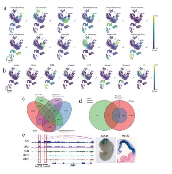 為了鑒定候選增強(qiáng)子,整合了ATAC-seq、CUT&Tag、Hic和基因表達(dá)數(shù)據(jù),并使用接觸活性算法來預(yù)測所有類型的皮質(zhì)細(xì)胞的增強(qiáng)子-基因相互作用。共預(yù)測了25,659個(gè)基因連鎖增強(qiáng)子。其中在發(fā)育中的人皮層分離的細(xì)胞上進(jìn)行了染色質(zhì)免疫沉淀和測序(PLAC-seq),發(fā)現(xiàn)了67,493個(gè)開放區(qū)以及10,050個(gè)預(yù)測的增強(qiáng)子,這些開放區(qū)和預(yù)測的增強(qiáng)子與預(yù)測的細(xì)胞類型特異性增強(qiáng)子相關(guān)的基因被富集。為了進(jìn)一步驗(yàn)證注釋的z確性,將開放區(qū)與從人類皮質(zhì)組織樣本生成的公開可用數(shù)據(jù)進(jìn)行關(guān)聯(lián)分析。發(fā)現(xiàn)scATAC-seq鑒定到了混合測序數(shù)據(jù)注釋的大多數(shù)開放區(qū),并且還鑒定了許多在混合數(shù)據(jù)中未預(yù)測的細(xì)胞類型特異性peaks,特別是富集在諸如小神經(jīng)膠質(zhì)細(xì)胞和內(nèi)皮細(xì)胞的稀有細(xì)胞群體中的開放區(qū)。在功能驗(yàn)證的前腦增強(qiáng)子中,大多數(shù)(319個(gè)中的304個(gè))與染色質(zhì)可及性開放區(qū)重疊,但只有67個(gè)重疊的增強(qiáng)子是通過激活接觸方法進(jìn)行預(yù)測??傊?,這些分析表明,scATAC-seq是一種從異質(zhì)組織樣本中檢測染色質(zhì)可及性模式的可靠方法。然而,預(yù)測的增強(qiáng)子與以前發(fā)表的研究的有限重疊表明,迫切需要更好地理解預(yù)測調(diào)控潛力的計(jì)算機(jī)算法的相關(guān)特征。
