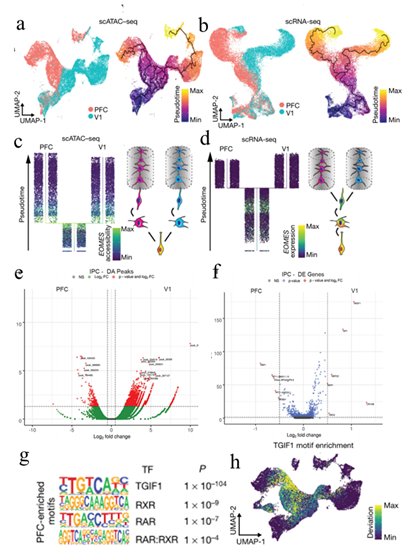 在神經(jīng)發(fā)生的早期,出現(xiàn)了特定區(qū)域類型的皮質(zhì)興奮性神經(jīng)元,但在不同區(qū)域的前體細(xì)胞之間只發(fā)現(xiàn)了有限的轉(zhuǎn)錄差異。調(diào)控元件的可及性變化通常先于基因表達(dá)。研究者比較了頭-尾軸兩端、PFC和V1的興奮性譜系細(xì)胞的scRNA-seq和scATAC-seq圖譜。在每種模式中,對細(xì)胞進(jìn)行擬時(shí)間分析,確定分化軌跡,并沿著該軌跡確定PFC和V1譜系之間轉(zhuǎn)錄或染色質(zhì)狀態(tài)差異變得明顯的“分支點(diǎn)”。與轉(zhuǎn)錄組數(shù)據(jù)揭示了興奮性神經(jīng)元的區(qū)域特異性分群不同的是,染色質(zhì)狀態(tài)特征表明PFC和V1中間前體細(xì)胞群體之間存在顯著差異。在轉(zhuǎn)錄水平上,PFC和V1IPCs只有少數(shù)幾個(gè)基因有差異表達(dá),而染色質(zhì)可及性分析發(fā)現(xiàn)這些細(xì)胞類型之間有1800多個(gè)差異可及區(qū)。