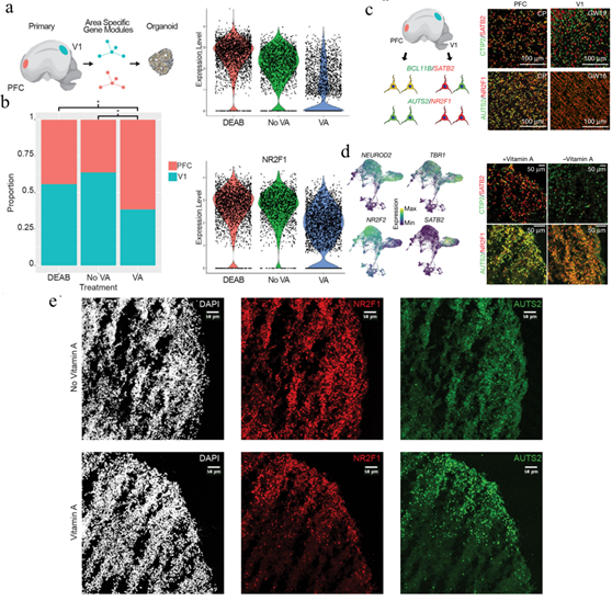 在哺乳動(dòng)物大腦發(fā)育的過程中,視黃酸信號在神經(jīng)組織中發(fā)揮著重要的作用。為了測試RA是否促進(jìn)人類PFC的分化,在含有或不含有維生素A(RA合成的前體)的情況下培養(yǎng)皮質(zhì)類器官。同時(shí)利用DEAB(一種有效的RA合成抑制劑)處理與維生素A一起培養(yǎng)的腦類器官。在分化的第10周,此時(shí)深層神經(jīng)正在發(fā)生,利用scRNA-seq分析了腦類器官。發(fā)現(xiàn)在維生素A存在下培養(yǎng)的興奮性前腦神經(jīng)元與不含維生素A或在DEAB存在下培養(yǎng)的腦類器官的神經(jīng)元是分開聚類的。還發(fā)現(xiàn)了區(qū)分PFC和V1皮層神經(jīng)元的信號。利用目前的分類方法注釋類器官神經(jīng)元中的PFC和V1神經(jīng)元的特征;與未使用維生素A培養(yǎng)或使用DEAB處理的神經(jīng)元相比,維生素A培養(yǎng)的類器官中PFC類似神經(jīng)元的比例始終較高。免疫染色證實(shí)了基因產(chǎn)物的差異表達(dá),并發(fā)現(xiàn)與含有維生素A培養(yǎng)的腦類器官的PFC特性一致。這些發(fā)現(xiàn)表明,RA信號通路有助于人類皮質(zhì)發(fā)育過程中PFC神經(jīng)元譜系的發(fā)育。
