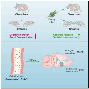 親肥胖與兒童認(rèn)知和社交能力低下密切相關(guān)。此外,已經(jīng)證明,母親肥胖會(huì)破壞后代的行為和腸道微生物群,母鼠或后代的高纖維飲食通過(guò)減輕突觸損傷和小膠質(zhì)細(xì)胞成熟缺陷恢復(fù)了這兩種行為和腸道微生物群。共同居住和糞便微生物群移植實(shí)驗(yàn)揭示了微生物群與行為變化之間的因果關(guān)系。此外,用微生物群衍生的短鏈脂肪酸治療也減輕了肥胖母鼠后代的行為缺陷??傊芯勘砻?,微生物群代謝物腦軸可能是母親肥胖引起的認(rèn)知和社會(huì)功能障礙的基礎(chǔ),高膳食纖維攝入可能是一種有希望的干預(yù)措施。