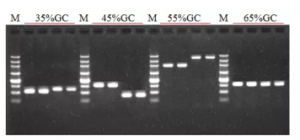圖3:對不同GC含量(35%~65%)片段進行擴增,可實現(xiàn)高質(zhì)量的擴增。M:250 bp DNA Marker。