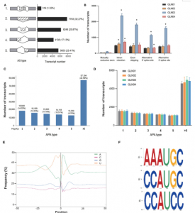 APA和AS的鑒定增強(qiáng)了我們對(duì)轉(zhuǎn)錄異構(gòu)體多樣性生物學(xué)作用的理解。在本研究中,確定了9035例AS事件,并將其分為五類(圖2)。在檢測(cè)到的全部轉(zhuǎn)錄本中,有6.86%由某種可變剪切形式產(chǎn)生,其中內(nèi)含子保留是最常見的可變剪切事件。此外,在88092個(gè)基因位點(diǎn)上進(jìn)一步確定了207955個(gè)APA事件。