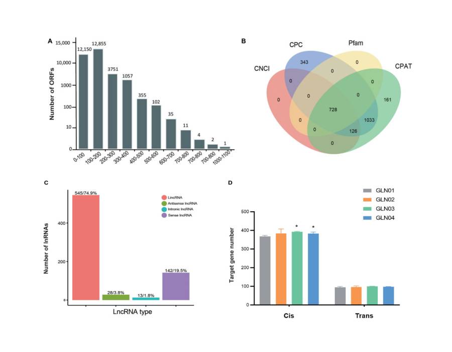 總共鑒定了38108個(gè)ORF,包括30323個(gè)(79.57%)完整的ORF,它們同時(shí)具有起始密碼子和終止密碼子。就完整的ORF而言,100-200 bp(12855個(gè)ORF)、0-100 bp(12150個(gè))和200-300 bp(3751個(gè))長(zhǎng)度所占比例最大(圖3A)。共鑒定出728個(gè)lncRNAs,平均長(zhǎng)度在298到4362 nt之間。這些lncRNAs進(jìn)一步分類為545個(gè)基因間區(qū)lncRNAs(74.86%)、28個(gè)反義lncRNAs(3.85%)、13個(gè)內(nèi)含子lncRNAs(1.79%)和142個(gè)正義lncRNAs(19.50%)(圖3C)。研究還發(fā)現(xiàn),這些lncRNAs調(diào)控的順式靶基因比那些反式靶基因多(圖3D)。發(fā)現(xiàn)在GLN01和GLN03之間(Student t檢驗(yàn),p=0.002),以及GLN01和GLN04之間(p=0.037),這些lncRNAs調(diào)控的順式靶基因顯著增加,而這些lncRNAs調(diào)控的反式靶基因在整個(gè)莖發(fā)育過(guò)程中未發(fā)現(xiàn)顯著變化。