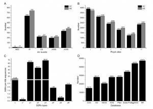六個樣本的平均全長嵌合序列FLNC讀取率達到80.68%,平均獲得20360個非冗余轉錄本,平均N50長度和平均長度分別為1607bp和1378bp(表 1),這比之前獲得的根轉錄組數(shù)據(jù)要好。LR和HR組的平均AS事件分別為1408和1605??勺兗羟蟹治鼋Y果顯示最常見的剪接類型是內含子保留,LR組占45.41%,在HR組占有46.29%(圖1 A)。互斥外顯子最不常見,在LR和HR轉錄組中分別為0.86%和1.04%。APA分析顯示具有一個多聚(A)位點的基因數(shù)量最高,LR和HR組的平均基因數(shù)分別為3896和3733,具有五個多聚(A)位點的轉錄本數(shù)量最低,分別為1242和1386(圖1B)。文中共對54135個序列(77606351bp)進行了SSR分析,包括16354個SSR序列和12855個含有SSR的序列。此外,單核苷酸、二核苷酸、三核苷酸、四核苷酸、五核苷酸和六核苷酸的數(shù)量分別為5522、4258、6139、176、44和215。其中,三核苷酸SSR的密度最高,為68(圖1C)。