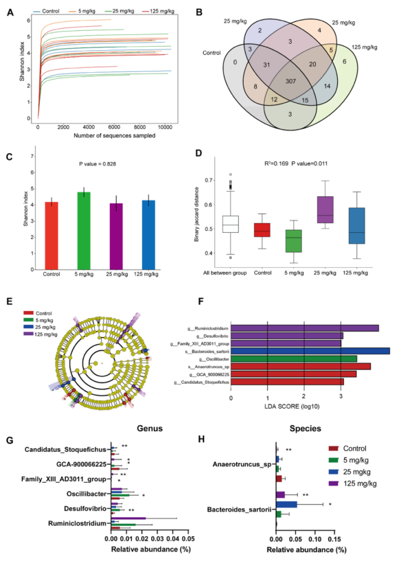 采集的新鮮盲腸內(nèi)容物進行16S rRNA基因測序分析,結(jié)果表明,各組的Shannon曲線趨于飽和,表明測序數(shù)據(jù)的數(shù)量和深度足以反映大部分微生物信息(圖3A)。在Venn圖中顯示了四組中共有和特有的OTUs(圖3B)。在本研究中,433個OTU中有307個是所有組共有的。接觸苯組和對照組之間的alpha多樣性并沒有導致微生物群落的差異(圖3C)。值得注意的是,beta多樣性結(jié)果顯示,暴露苯組和對照組的植物區(qū)系組成和分布有顯著差異(圖3D)。通過LEfSe分析,在暴露于苯的小鼠和對照小鼠盲腸內(nèi)容物中共鑒定出8個腸道微生物群,這些差異微生物群的相對豐度主要反映在屬和種水平上的變化(圖3E-F)。在屬水平,與對照相比,125 mg/kg苯暴露組中Ruminiclostridium, Desulfovibrio 和 Family_-XIII_AD3011_group,5 mg/kg苯暴露組的Oscil-libacter相對豐度顯著提高;而GCA-900066225和Candidatus_stoquefichus的豐度則顯著降低(圖4G)。在種水平,25 mg/kg苯暴露組Bacteroides_sartorii的豐度高于對照組,Anaerotruncus_sp的豐度呈相反的趨勢(圖4H)。