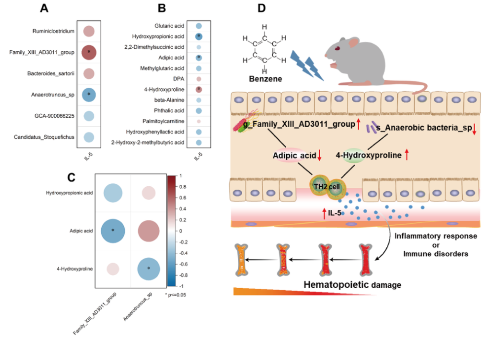 前人文獻表明TH2細胞分泌和產(chǎn)生了上調(diào)的細胞因子(如IL-4、IL-5和IL-10),并在機體中發(fā)揮重要的免疫作用。IL-5在苯暴露組和對照組表現(xiàn)出顯著的劑量-反應(yīng)關(guān)系,與造血損傷呈極顯著負相關(guān)。分析表明與IL-5與Family_XIII_AD3011_group呈顯著負相關(guān),與Anaerotruncus_sp呈正相關(guān)(圖6A)。此外,羥丙酸和己二酸與IL-5呈負相關(guān),而4-羥脯氨酸與IL-5呈正相關(guān)(圖6B),F(xiàn)amily_XIII_AD3011_group和Anaerotruncus_sp的豐度變化分別與己二酸和4-羥脯氨酸呈顯著負相關(guān)。綜上所述,F(xiàn)amily_XIII_AD3011_group和Anaerotruncus_sp可能調(diào)節(jié)了已二酸和4-羥脯氨酸的產(chǎn)生水平,這些代謝產(chǎn)物進一步激活TH2細胞大量分泌IL-5,引起促炎反應(yīng)或免疫紊亂(圖6D)。這可能是苯誘導造血毒性的初步潛在機制,有待進一步研究證實。