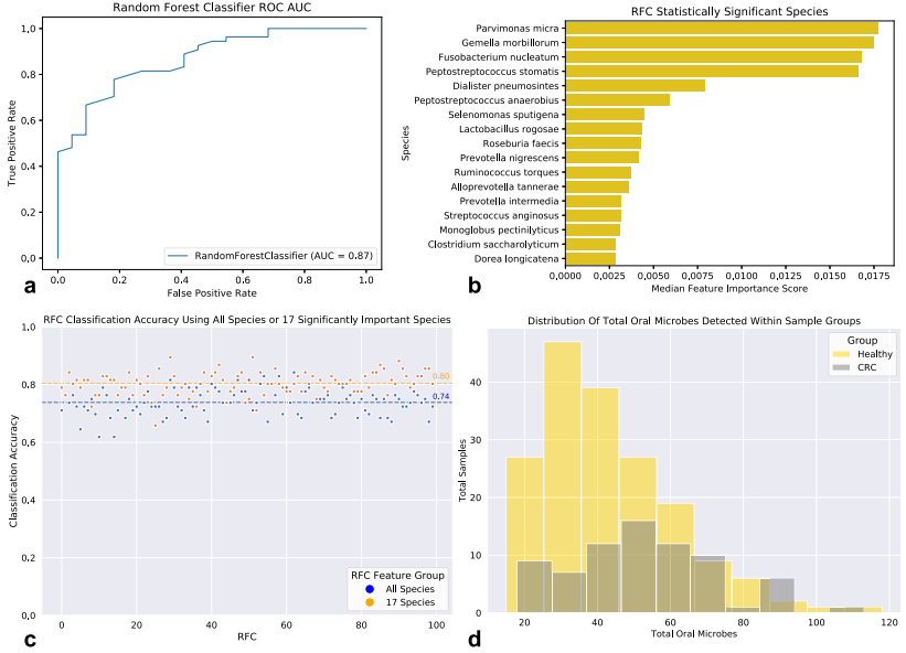 有趣的是,許多在CRC中被認(rèn)為非?!爸匾鼻蚁鄬ωS度較高的物種也存在于口腔微生物組中,也與部分口腔疾病(牙周炎、根尖周病變、根管感染、口腔癌等)、CRC風(fēng)險的增加有關(guān)。隨后,我們通過人類口腔微生物數(shù)據(jù)庫(eHOMD)對我們樣本中的所有口腔物種進(jìn)行分類,發(fā)現(xiàn)與健康組相比,CRC相關(guān)腸道微生物組內(nèi)存在的總口腔微生物種群豐富度顯著增加(MWU: pvalue = 6.51e-05)(圖2 d)。
