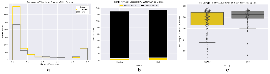 使用基于em的方法計算每個樣本內(nèi)物種的相對豐度,以構(gòu)建一個樣本分類單元矩陣,通過測量每個樣本的細(xì)菌豐富度和Shannon指數(shù),利用該矩陣探究兩個樣本組(健康和晚期CRC)的微生物多樣性。CRC組的樣本顯示出更大的多樣性,包括豐富度和Shannon指數(shù)(Mann-Whitney U檢驗:MWU);豐富度:MWU pvalue = 0.0005, Shannon指數(shù):MWU pvalue = 0.0009)(圖一a,b)。由于物種多樣性的量度對物種均勻度和豐富度的敏感性不同,還應(yīng)用了辛普森指數(shù)來計算樣本組內(nèi)的物種多樣性,這些結(jié)果與之前的分析一致,CRC樣本中的物種多樣性與健康樣本中的物種多樣性有顯著性差異(MWU值= 0.0238).