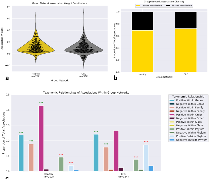 群體網(wǎng)絡(luò)包含相似的關(guān)聯(lián)權(quán)重分布,正相關(guān)比負(fù)相關(guān)更多(圖4a)。值得注意的是,與健康網(wǎng)絡(luò)相比,CRC包含更多的負(fù)相關(guān)。29%的負(fù)相關(guān)涉及一種被認(rèn)為是口腔微生物的物種,而在健康網(wǎng)絡(luò)中,沒有發(fā)現(xiàn)涉及口腔菌群。在網(wǎng)絡(luò)中發(fā)現(xiàn)的大多數(shù)關(guān)聯(lián)是該網(wǎng)絡(luò)獨有的(健康:69%,CRC:72%)(圖4b)。我們假設(shè)群落結(jié)構(gòu)的這種巨大差異可以反映生態(tài)系統(tǒng)的變化,并進(jìn)而分析了網(wǎng)絡(luò)中物種之間的分類關(guān)系(圖4c)。兩個網(wǎng)絡(luò)在同一屬內(nèi)的物種(健康:MCS pvalue= 0.00099,CRC:MCS pvalue= 0.00099)和家族(健康:MCS值= 0.00099,CRC:MCS= 0.00099 )。然而,只有在健康組的網(wǎng)絡(luò)中,物種與來自同一順序的其他物種的積極相關(guān)仍然明顯多于隨機相關(guān)(健康:MCS pvalue= 0.00099,CRC: MCS pvalue = 0.44)。與健康網(wǎng)絡(luò)(健康:4%,CRC:17%)相比,CRC的網(wǎng)絡(luò)在分類上的遠(yuǎn)緣關(guān)系中顯示出更大的豐度,在健康網(wǎng)絡(luò)中分類上的遠(yuǎn)緣微生物之間的正關(guān)聯(lián)仍然顯著較少(門內(nèi):MCS值= 0.00099,門外:MCSp值= 0.00099)和CRC(門內(nèi):MCS pvalue= 0.00099,門外:MCS pvalue= 0.00099)而不是隨機網(wǎng)絡(luò)。