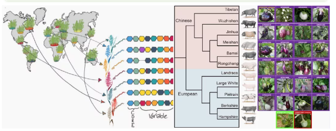 因此對(duì)于一個(gè)物種來(lái)說(shuō),如果只使用單一的參考基因組進(jìn)行遺傳馴化變異的研究,可能會(huì)丟失掉大量有意義的基因信息。為了解決這些問(wèn)題并充分理解關(guān)鍵物種中重要性狀形成機(jī)理,為育種奠定重要的研究基礎(chǔ),動(dòng)植物泛基因組研究應(yīng)運(yùn)而生。